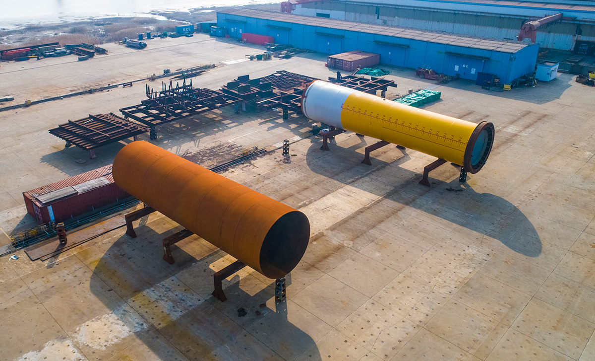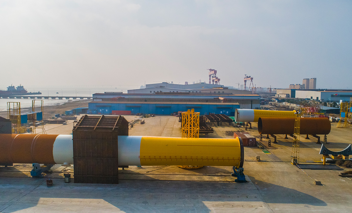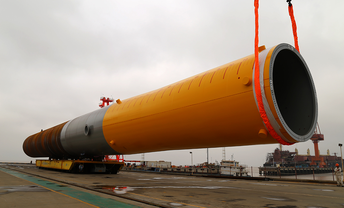 单桩基础目前是全球范围内运用最普遍的一种海上风电基础,在己建成的海上风电场中得到了最广泛的应用。海上风电单桩基础直径6~10m,基础桩长100米左右,采用大型液压打桩锤将其打入海床,单桩上部通过法兰及螺栓与塔筒连接。单桩基础适用于水深较浅10~30m或中等水深30~60m水域,可安装各种容量的风机。